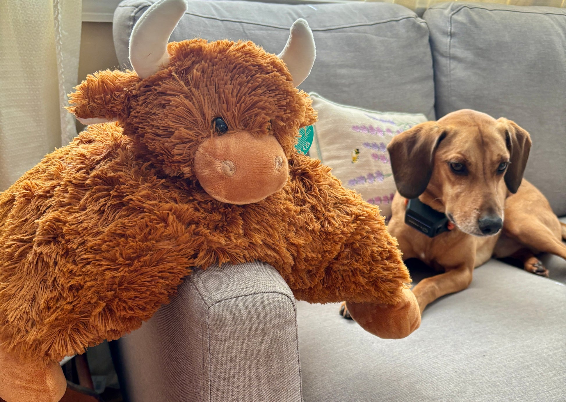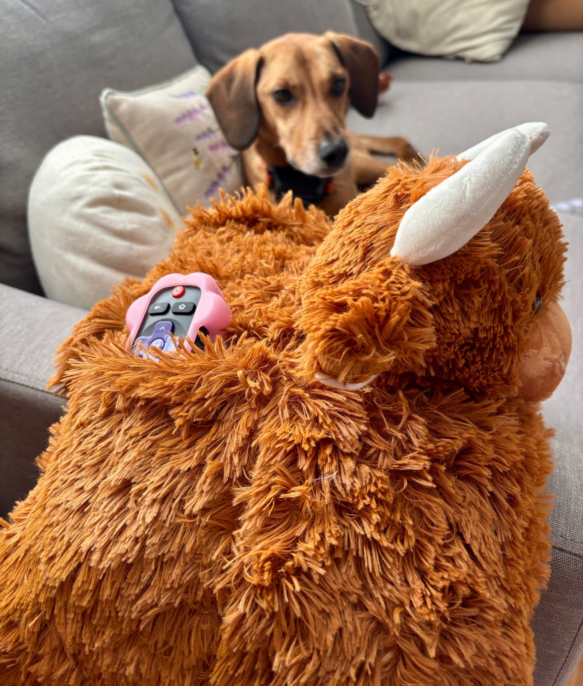 Fits over the arm of your sofa to keep your remote control and other goodies safe (photo of sheep for reference but we only carry the cow)