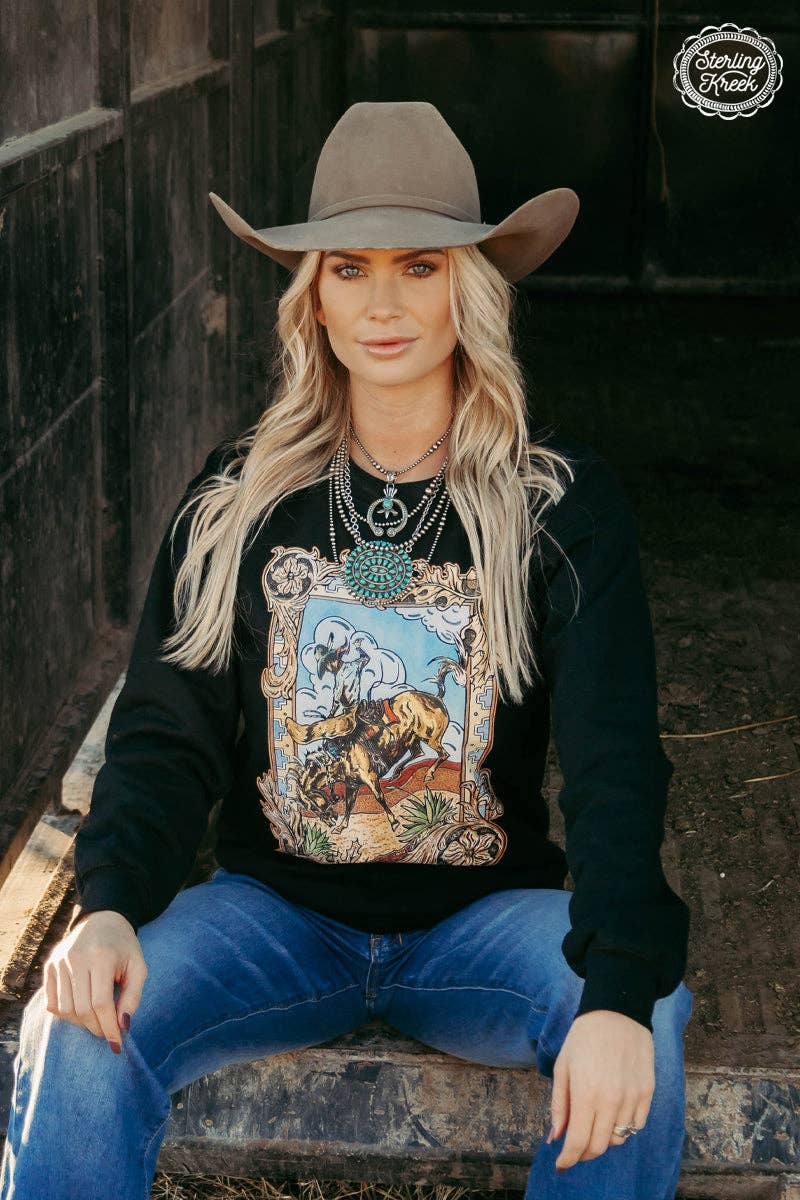 The Bronc by Blu is your perfect rodeo-ready ride! Keep warm and look wild with this black sweatshirt featuring a tooled boarder of a bucking bronc and a classic Western desert background. Yeehaw!