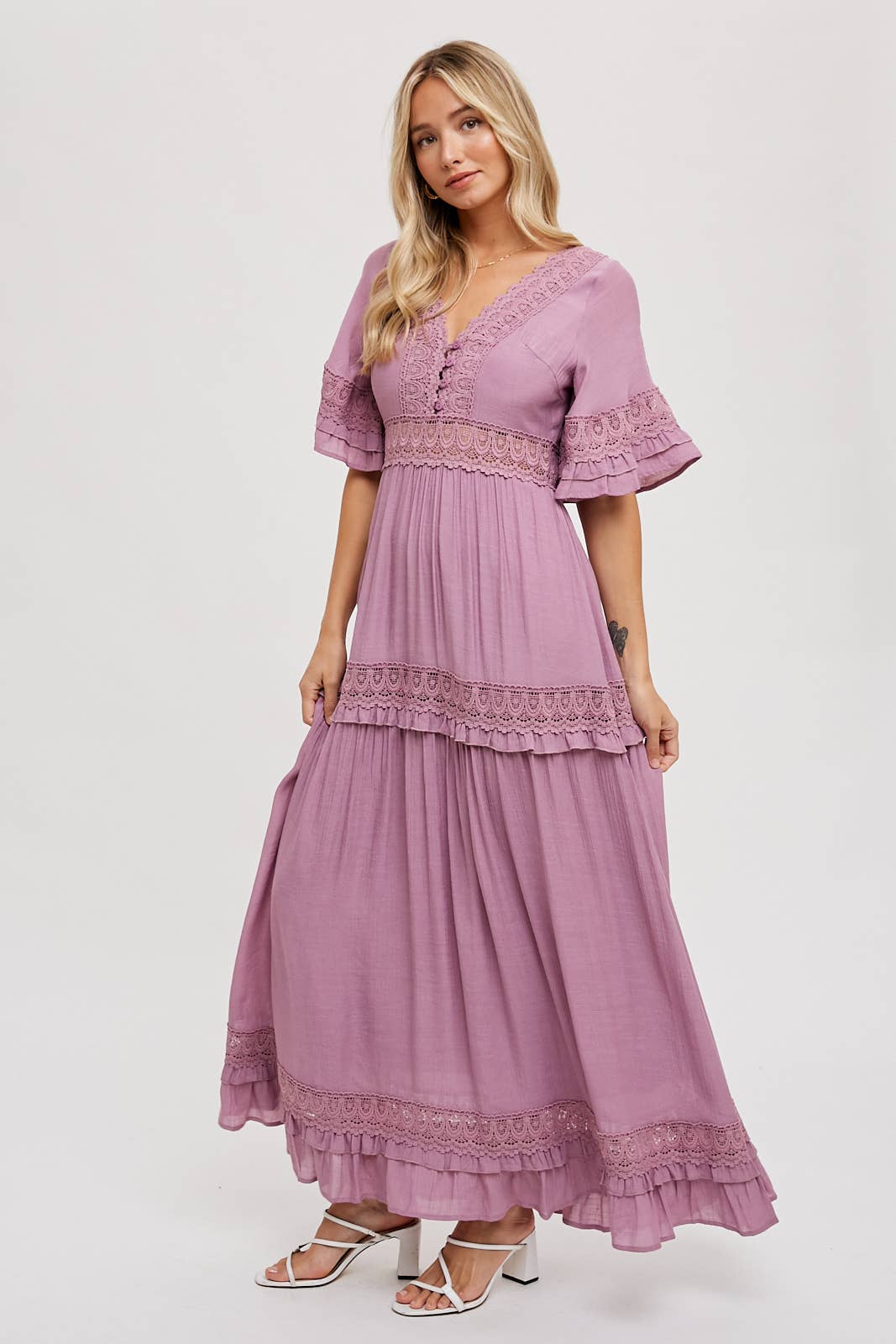 Introducing a graceful V-neck lace-trimmed maxi dress that effortlessly blends elegance and charm. This dress features a flattering V-neckline and short sleeves, creating a sense of refinement and sophistication. The delicate lace trim adds a touch of romantic allure, enhancing the overall aesthetic. Crochet frill trimming details contribute to the dress's femininity and create a subtle and captivating texture. Elevate your attire with this lace-trimmed maxi dress, a statement piece that seamlessly combines both style and grace.
